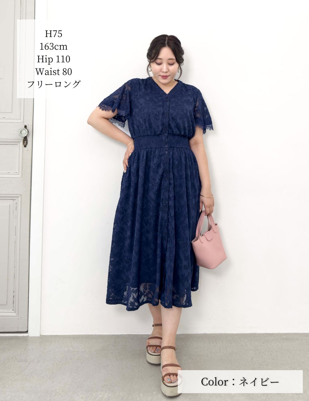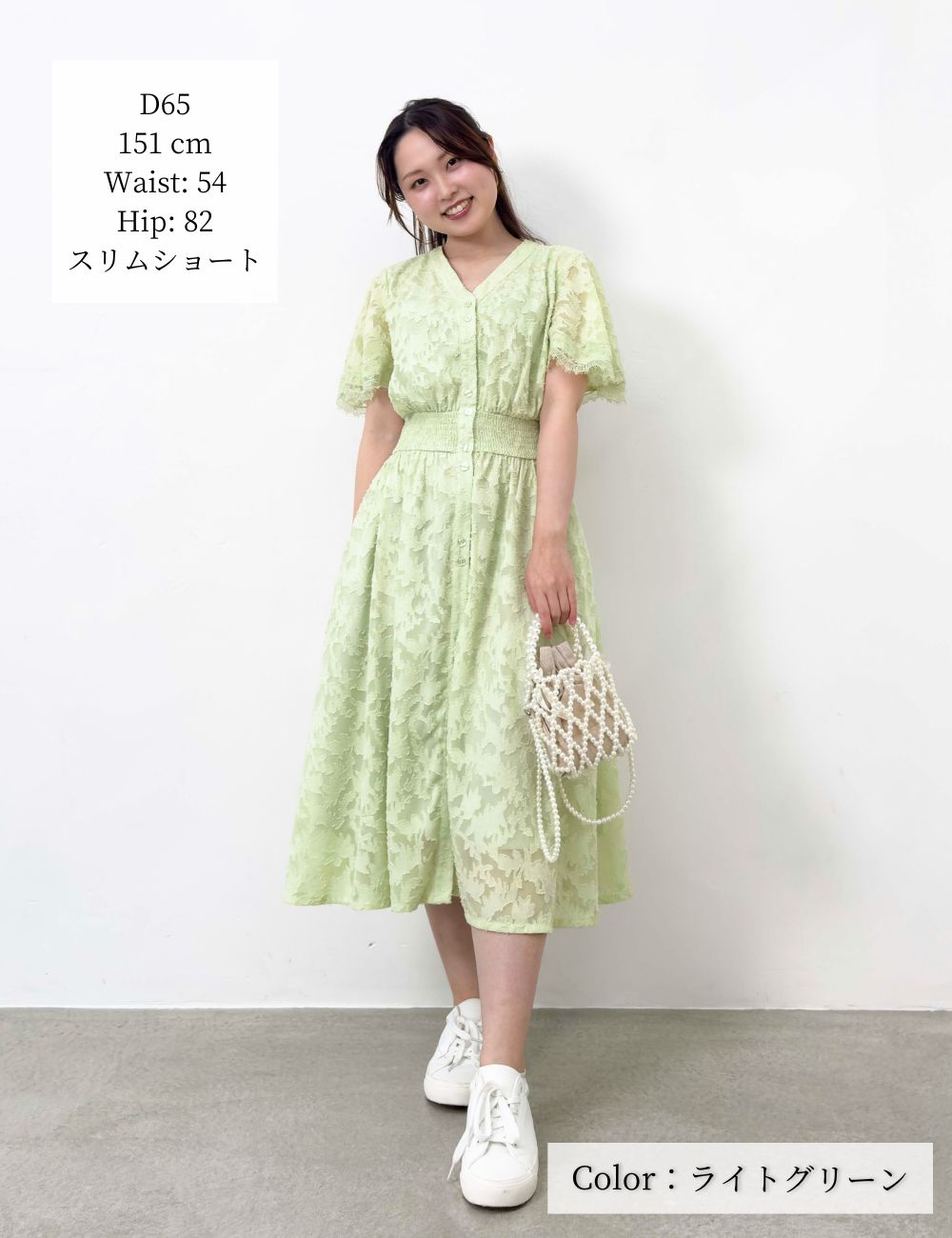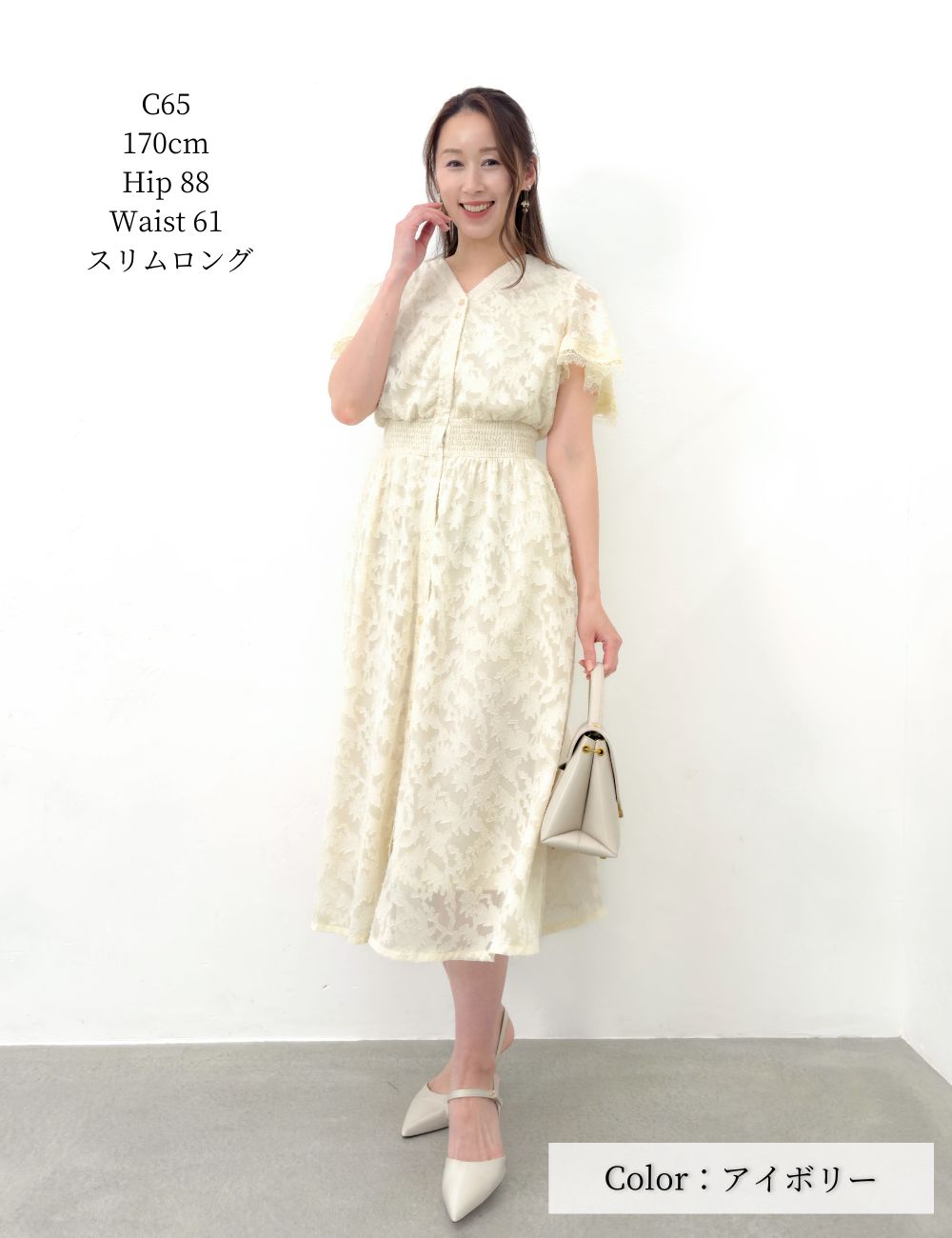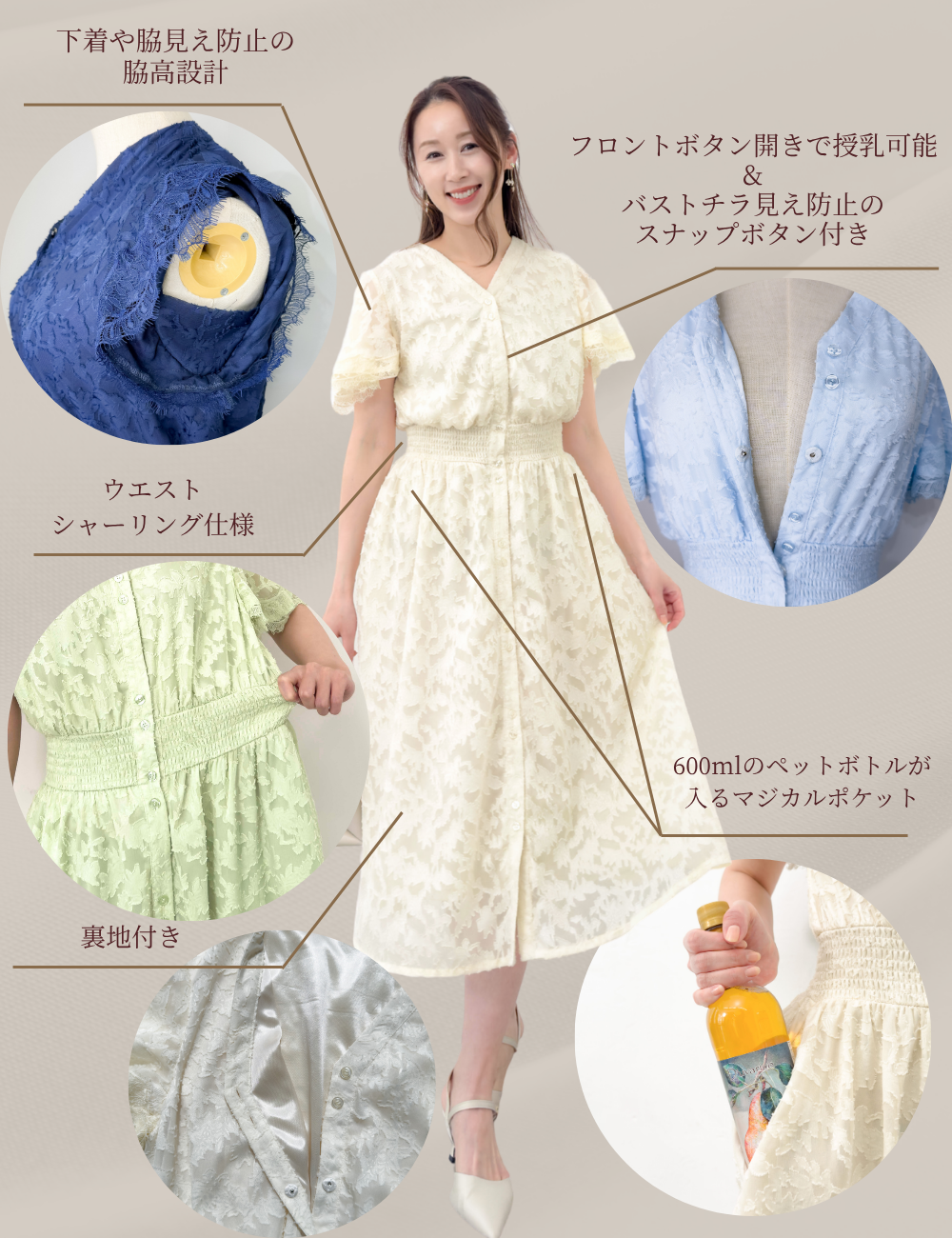 バストとウエストにスナップボタンを備え、大きめバストの方でも着崩れしにくい仕様です。