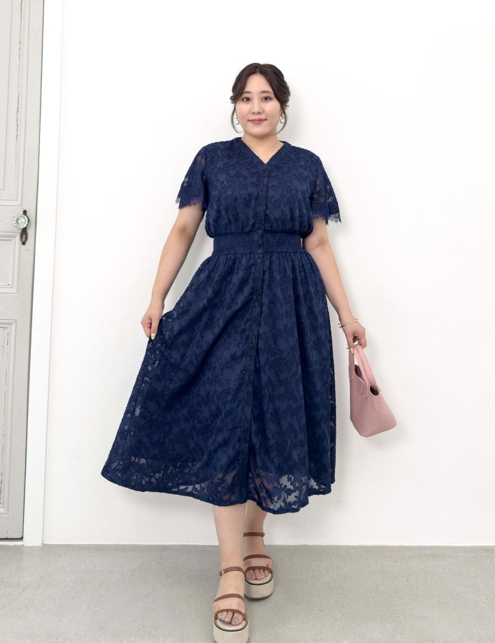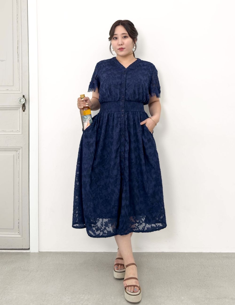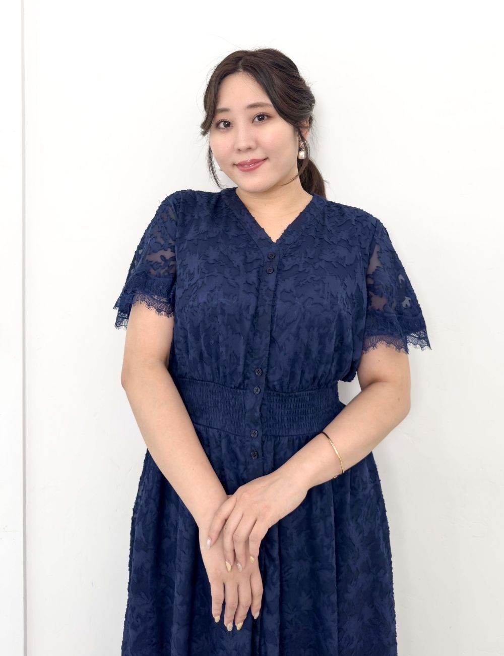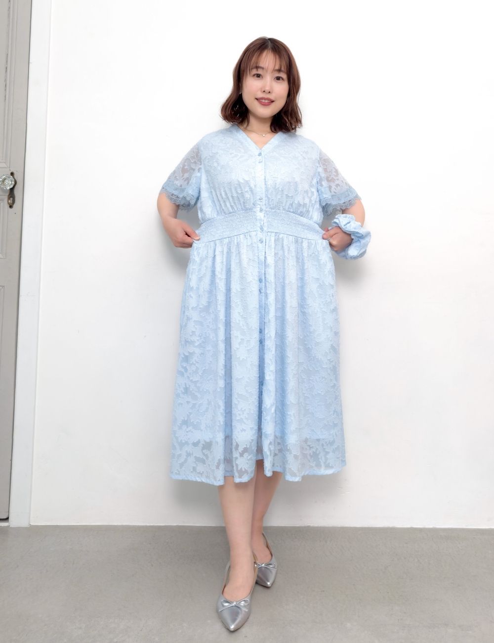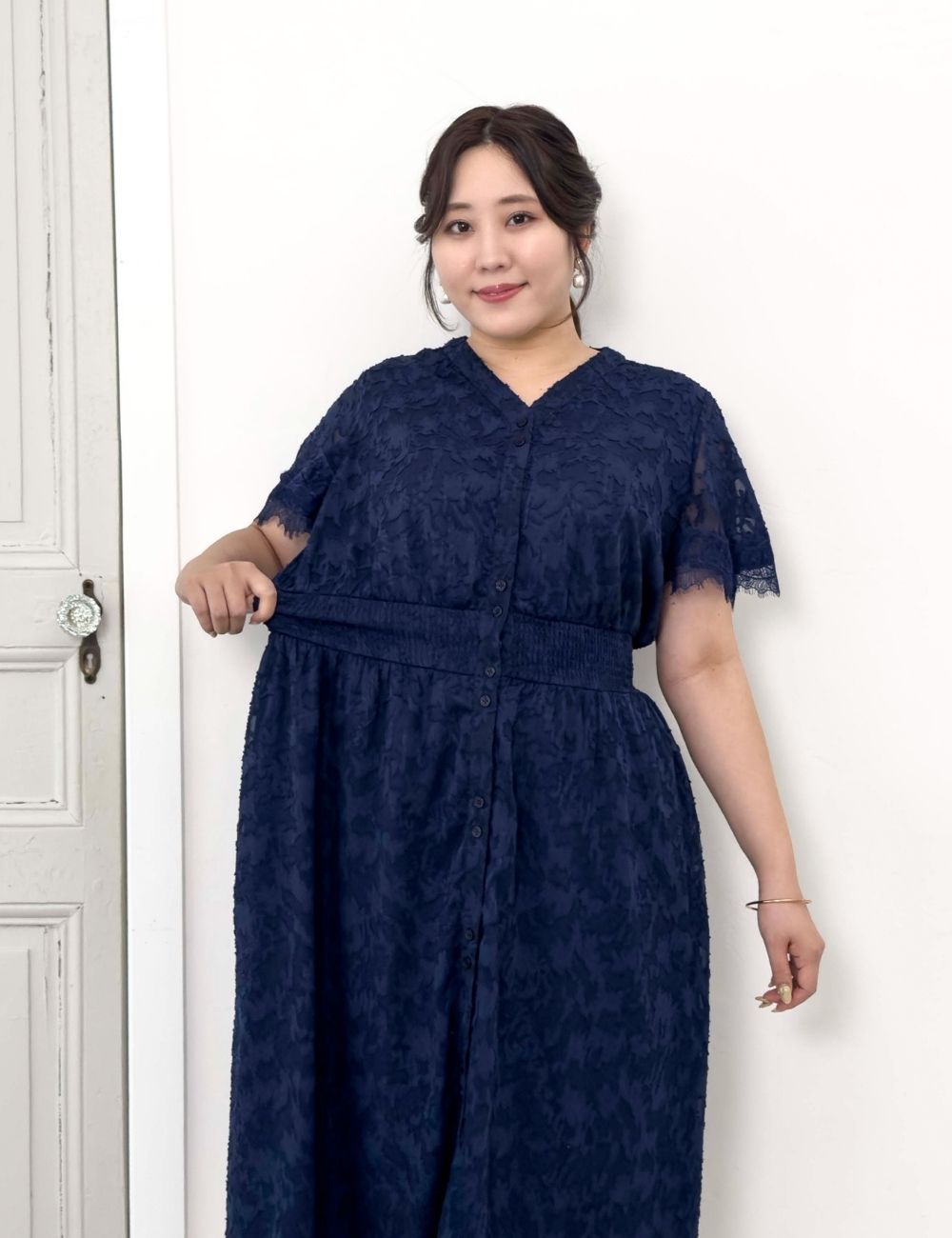 バストとウエストにスナップボタンを備え、大きめバストの方でも着崩れしにくい仕様です。