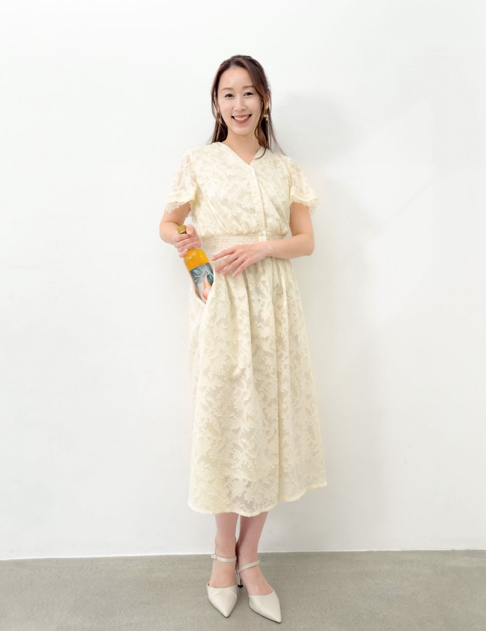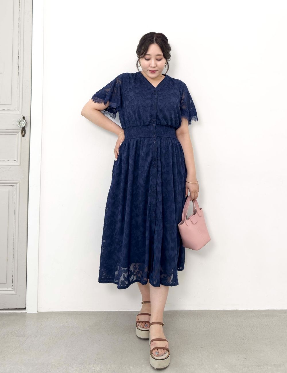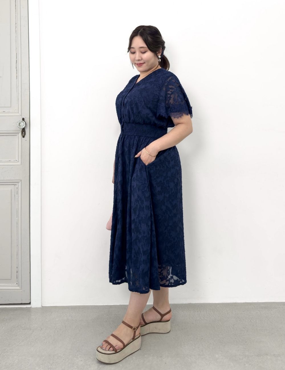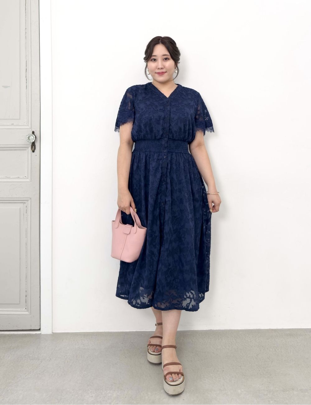 バストとウエストにスナップボタンを備え、大きめバストの方でも着崩れしにくい仕様です。