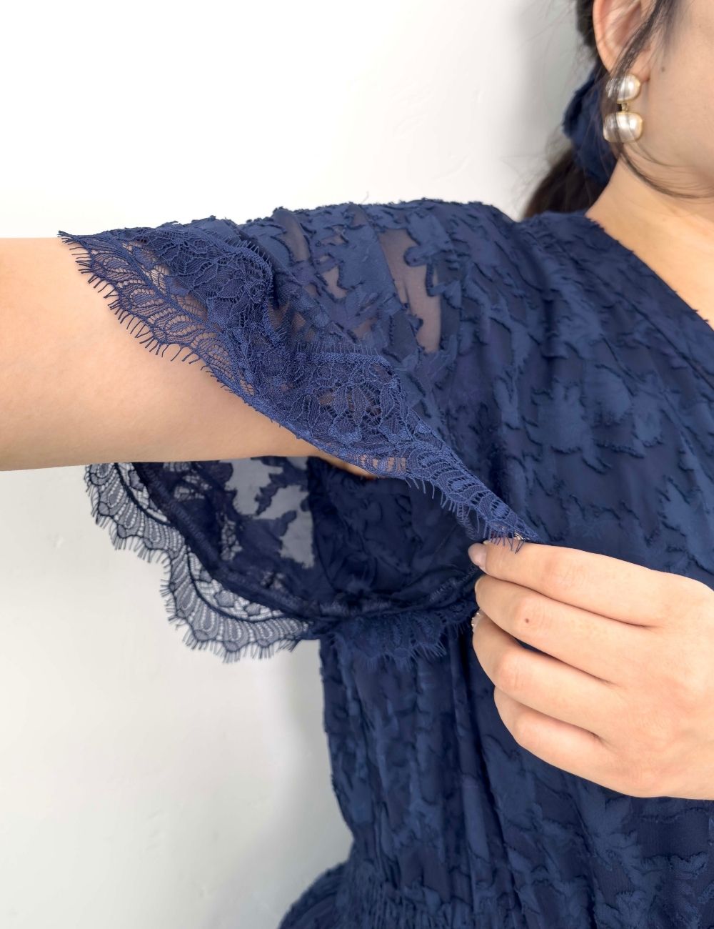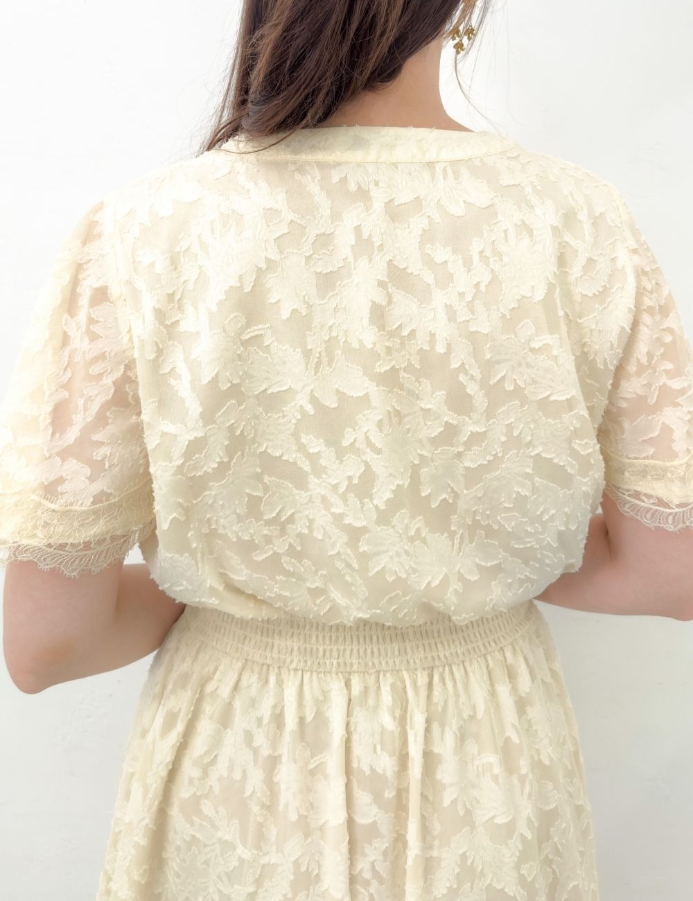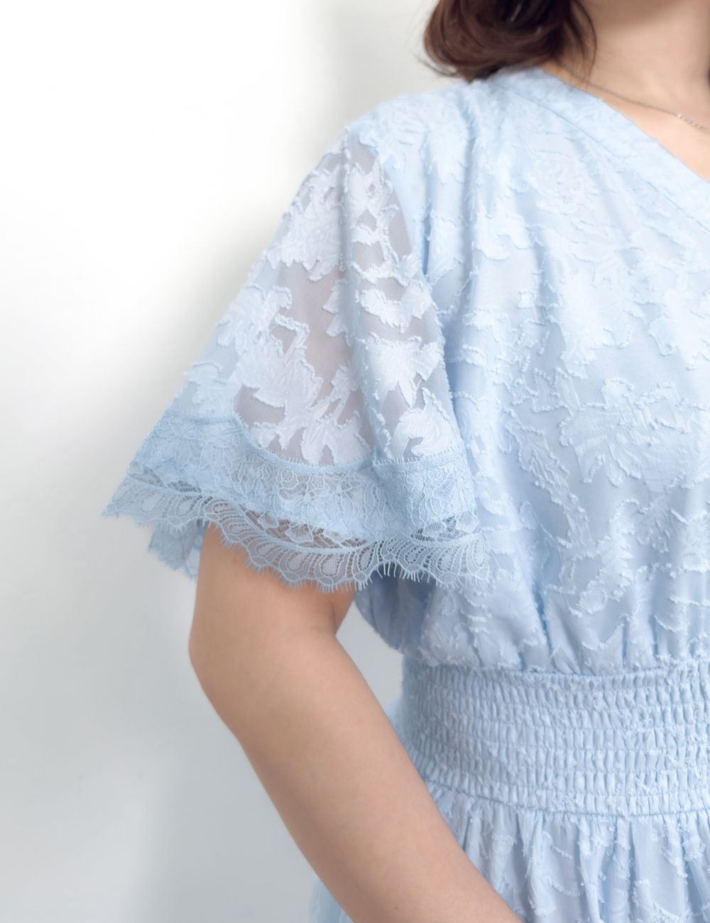 ほんのり透け感のあるラッフル袖は、脇高ブラでも下着が見えにくいチラ見え防止仕様。同色でまとめた袖口のレースがエレガントに二の腕をカバーします。