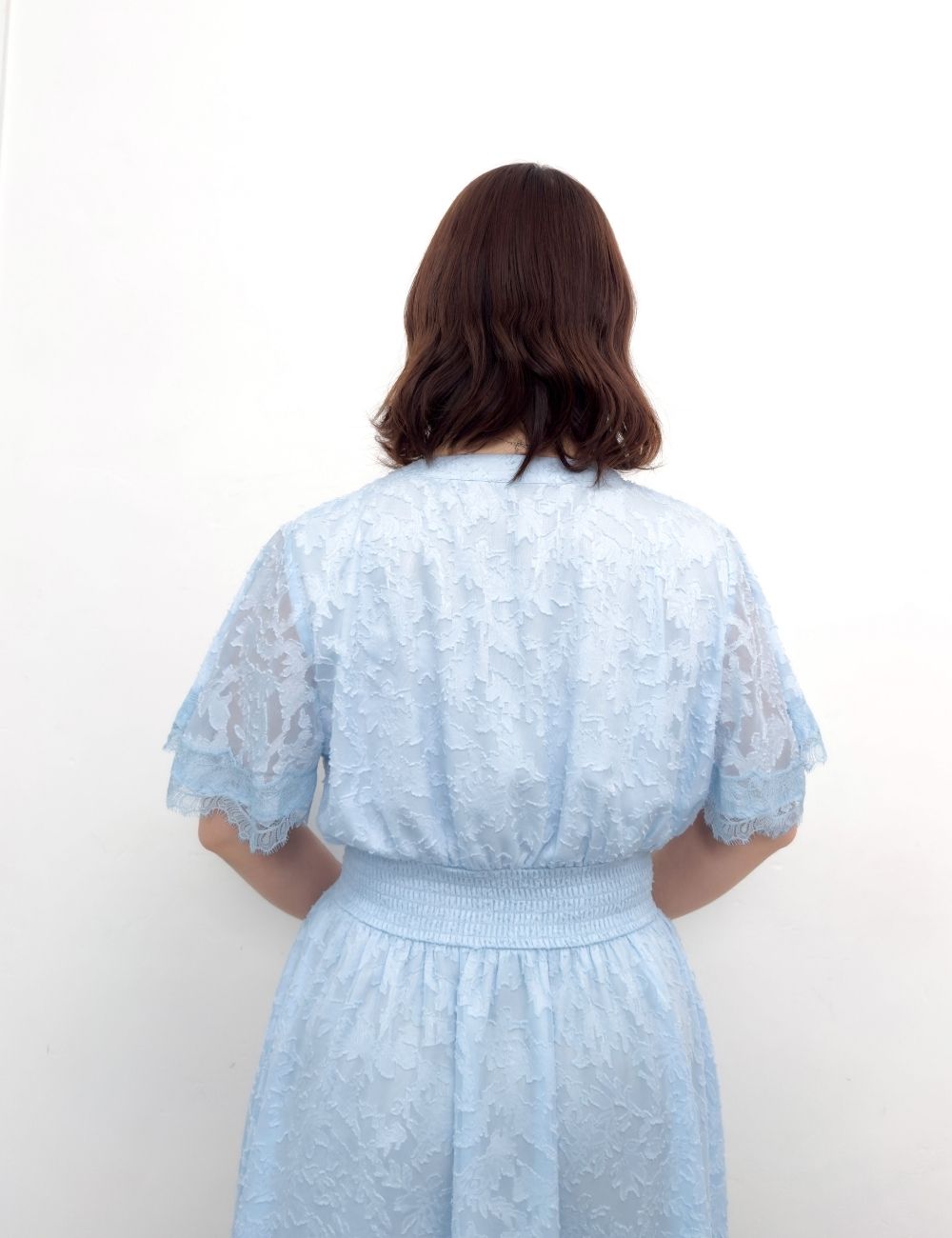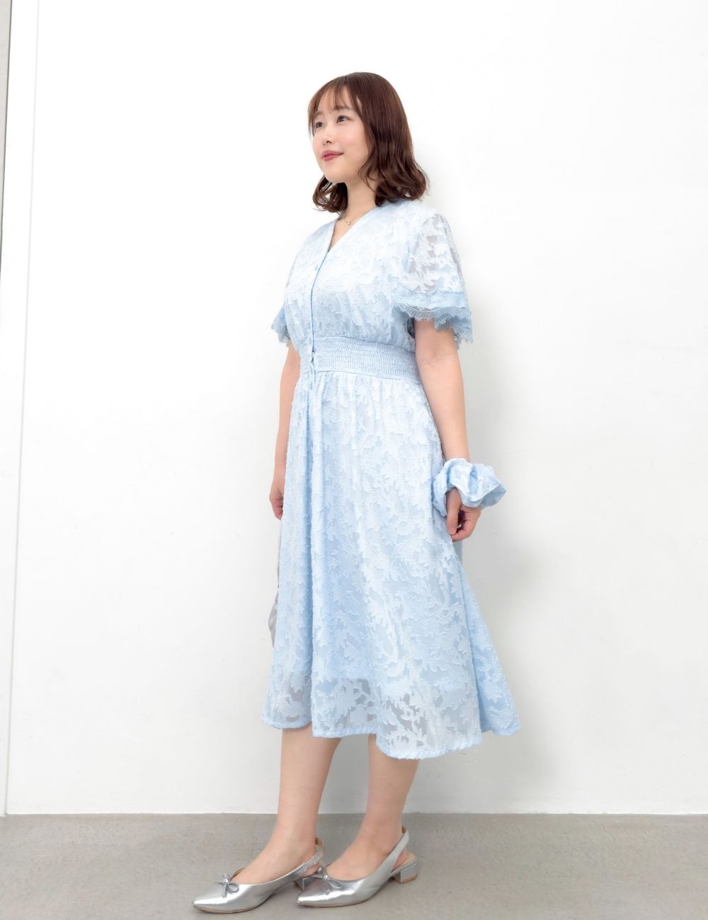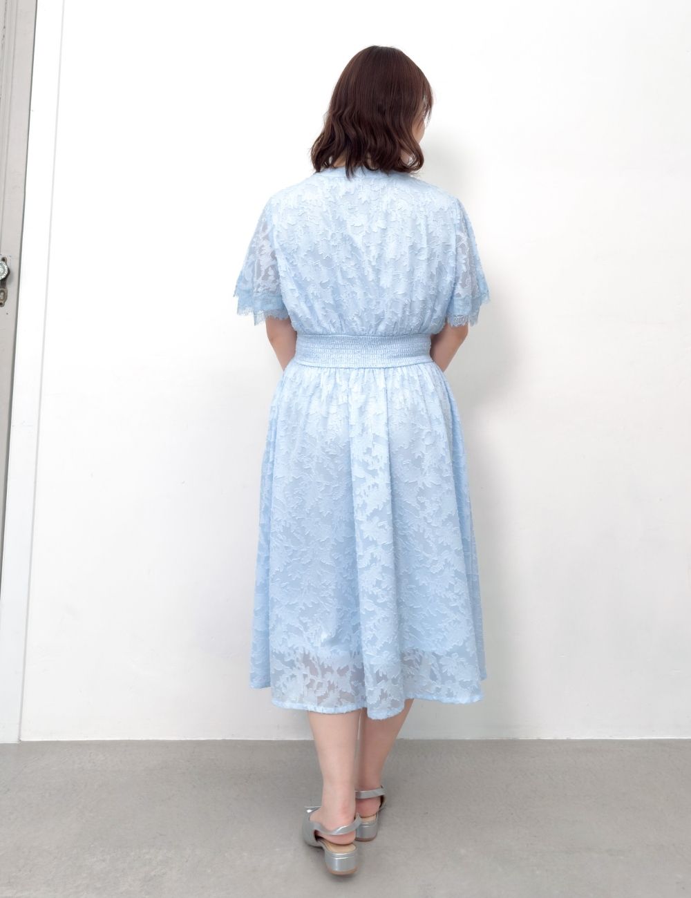 ほんのり透け感のあるラッフル袖は、脇高ブラでも下着が見えにくいチラ見え防止仕様。同色でまとめた袖口のレースがエレガントに二の腕をカバーします。