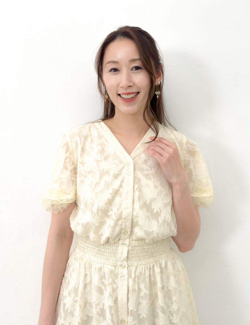 首まわりはVネックのノーカラーシャツデザインで顔周りがすっきりと見える、清楚なAラインシルエットに仕上げました。