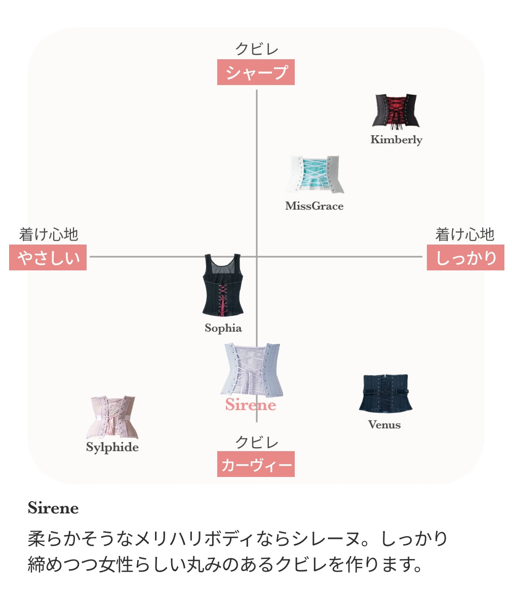 シャープタイプのKimberlyやMiss Graceよりも丈が長くなり、長身の方や下腹が気になる方でもしっかり補正できます。
